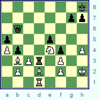 Black to move in this position. (31... ???) Black (GM H. Mecking) has played a nearly perfect game ... and has definite winning chances. What is the best move that the second player can play in this position? [Stumped? See the actual game.] Chess Puzzle # 45